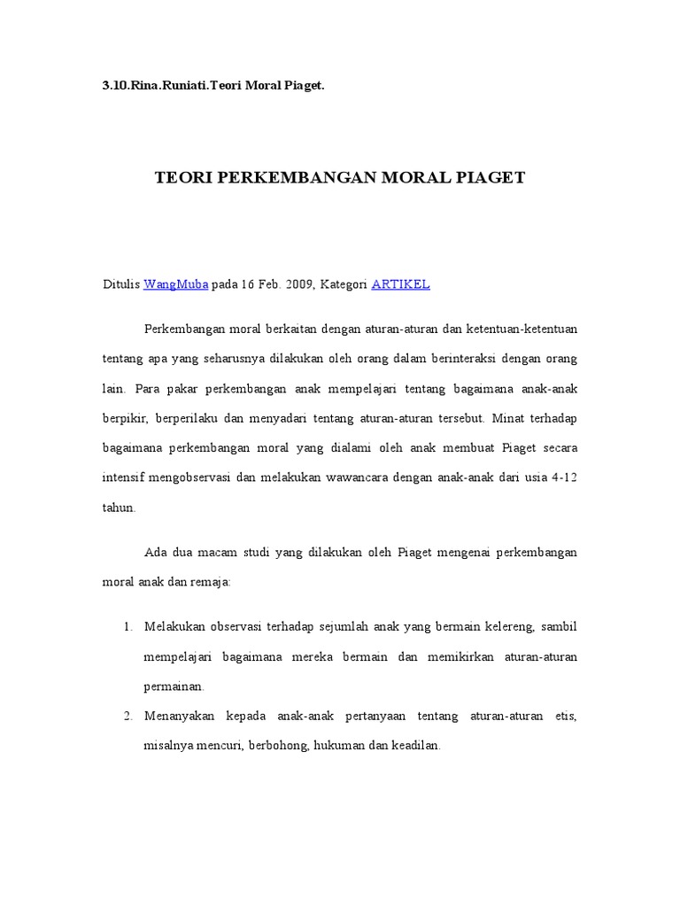 Piaget (dalam slavin, 2006:51) bahkan mempercayai bahwa struktur kognitif dan kemampuan kognitif anak adalah dasar. Tahapan perkembangan moral adalah ukuran dari tinggi rendahnya moral seseorang berdasarkan perkembangan penalaran moralnya seperti yang diungkapkan oleh lawrence kohlberg. Perbuatan moral individu dimotivasi oleh penghindaran terhadap hukuman dan. Lawrence kohlberg menjabat sebagai salah satu profesor di universitas chicago serta universitas harverd. Dalam bergaul, remaja sudah mulai selektif dalam memilih teman.