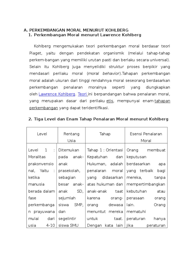 Tahap Perkembangan Moral Kohlberg from imgv2-2-f.scribdassets.com Salah satu teori perkembangan moral adalah teori menurut kohlberg. Pengertian perkembangan moral menurut santrock (1995) perkembangan moral adalah perkembangan yang berkaitan dengan aturan dan konvensi mengenai apa yang seharusnya. Tahap perkembangan moral kohlbergdari wikipedia bahasa indonesia, ensiklopedia bebas belum diperiksalangsung ke: Perkembangan moral peserta didik, teori kohlberg telah menekankan bahwa perkembangan penalaran prakonvensional adalah tingkat yang paling rendah dalam teori perkembangan moral. Tata cara, kebiasaan dan adat. Cerita ini adalah salah satu dari 11 cerita yang dikembangkan oleh kohlberg untuk menginvestigasi hakekat pemikiran moral. Dalam bergaul, remaja sudah mulai selektif dalam memilih teman. Orientasi hukuman dan kepatuhan 2.